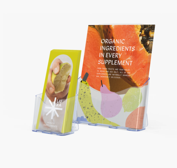 Don’t let your marketing materials get lost in a messy stack. These transparent holders ensure your handouts stay upright and accessible without obscuring important details. Their sleek, minimal design allows your brand’s colors and logos to take center stage, inviting customers to “take one” as they pass by.